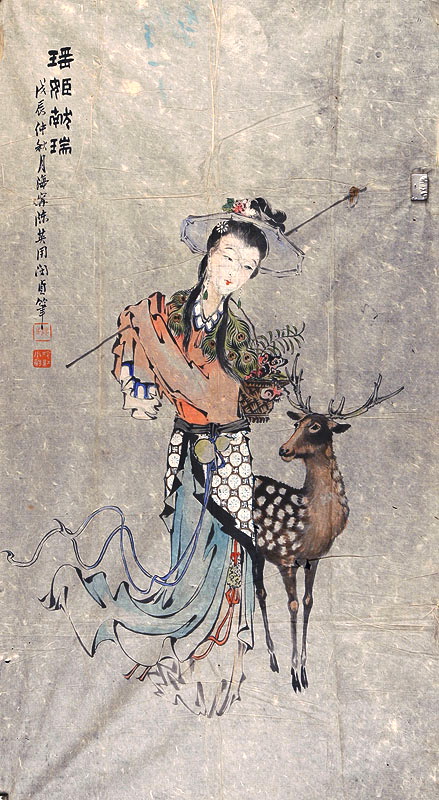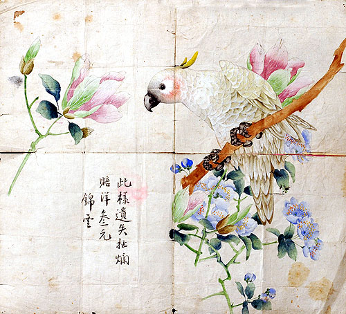 清末像杨世焯这样敢于用优秀的绘画才能,为民间刺绣工艺倾注个人所能,是非常可贵的。在他的影响下,朱树之、陈英等地方画家也介入了湘绣的研究设计(图1-4-5-17 画师陈英所绘湘绣画稿1,图1-4-5-18 画师陈英所绘湘绣画稿2),使湘绣艺术形成了独有的风格,并茁壮成长。清宣统二年(1910年),在清政府举办的南洋劝业会上,一批参展的湘绣一展风采,赢得广泛好评,湘绣名声鹊起。最让湘绣美名远扬的要数1933年绣制的美国罗斯福总统像了,这幅湘绣肖像由唐仁甫画、杨佩珍绣,在美国芝加哥百年进步博览会上展出引起轰动,罗斯福总统亲临参观,为绣像的逼真和精彩而赞叹。现在这幅绣像仍收藏在美国亚特兰大市“小白宫”博物馆中。