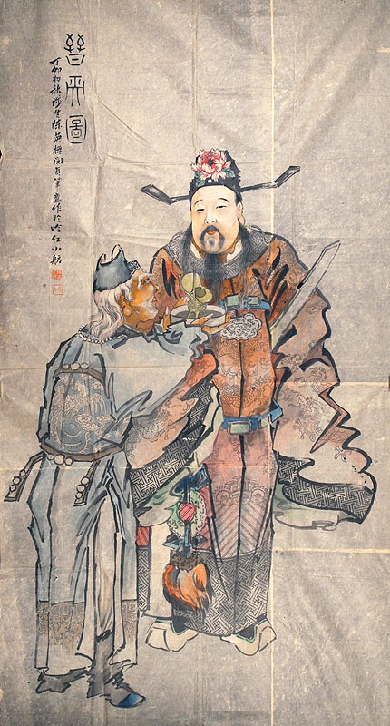 湘绣宗师胡莲仙(1832年-1899年)是吴彩霞绣坊的开创者,她出生于安徽,少时随父久居江苏吴县,学会了苏绣,20岁与湖南湘阴人吴健生结婚,后迁居湘阴,中年寡居,一度还在曾国藩家传教刺绣技术,1879年胡莲仙初挂“绣花吴寓”招牌,继改“彩霞吴莲仙女红”招牌,又于光绪二十八年(1896年)胡莲仙之子吴汉臣、吴勋臣在长沙红牌楼开设“吴彩霞绣坊”,由此开启了湘绣商品发展之门(图1-4-5-13 清 湘绣 吴彩霞绣坊产品 湖南博物馆藏)。当时,湖南巡抚赵尔巽就将长沙红牌楼吴彩霞绣庄及附近典当所藏的湘绣搜购一空,运售出境,使湘绣首次走出国门。无独有偶,1905年端方接任湖南巡抚,他也对湘绣情有独钟,在任期内他不仅专门雇佣三十余名绣工为其刺绣字画,还在他离任之前,特地派一位鉴赏专家,以高于市价一倍的价格,在锦云绣馆定绣了大批的钟鼎、碑帖、名人字画为图稿的绣品(图1-4-5-14 锦云绣馆原始绣稿 湖南省博物馆藏),这批湘绣有的被他赠北京王宫大臣,有的带往国外赠与外国官员,这是第二次湘绣品大量流出国门,也使湘绣之名远播海内外。一时间,更多的湘绣馆也随之增设,湘绣形成繁荣之势。