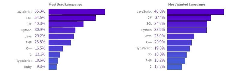 在语言方面,JavaScript(65.3%)是调查中最常用的语言,其次是 SQL(54.5%)。之后,C#(40.3%)、Python(30.9%)和 Java(29.2%)。