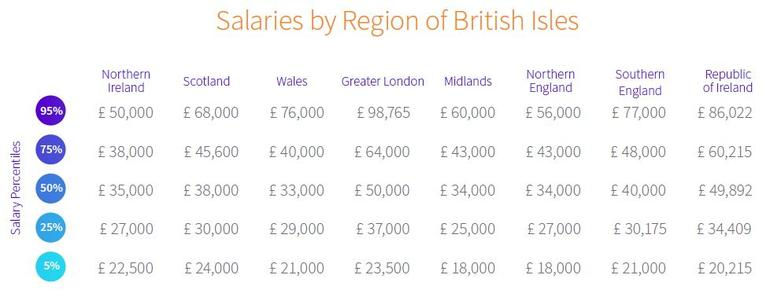 其中,机器学习的专家收入最高,为 56851 英镑。Web 开发人员平均为 42717 英镑,比桌面软件(£42313)和移动开发(£42223)略好。图形程序员 Graphics programmers(£39832)和平面设计师(£35863英镑)的收入最低。