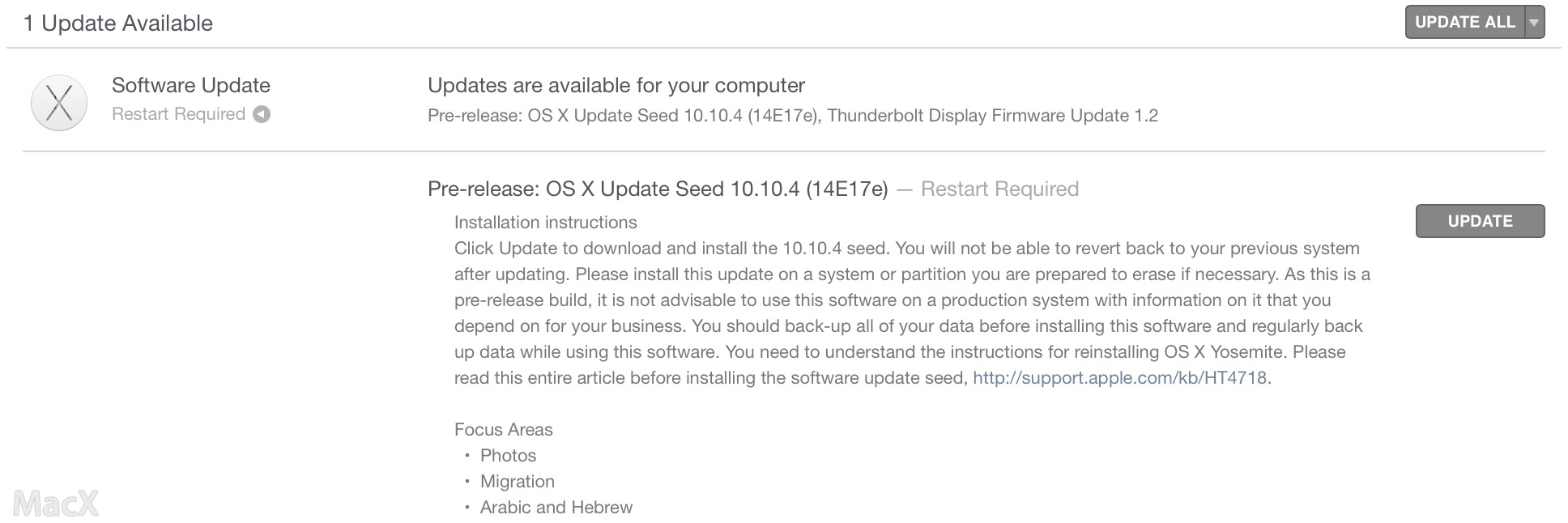 OS X 10.10.4 beta 3 编译号为 14E17e,可以通过 Mac App Store 更新或者在 Mac 开发者中心下载。苹果要求开发者关注照片、迁移、阿拉伯语和希伯来语方面的问题。OS X 10.10.3 包含很多消费者可以发现的新功能,包括全新照片、全新设计的 emoji 选择器,多肤色 emoji 等。当然,OS X 10.10.4 并没有包含设计改变和新功能,只是改善了系统的性能和修复了 Bug。