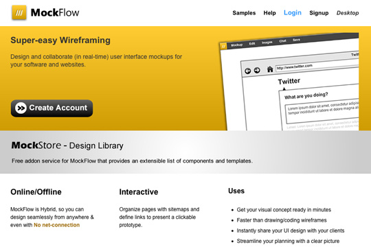 MockFlow是一款很优秀的工具,类似于 Axure ,不过它是一款完全基于Web浏览视窗的产品原型制作工具,可以帮助你对自己的软件用户界面以及在网页重构时进行设计和实时协作。它配备了大量的内置组件和图标,如按钮(Button)、图片(Image)、文字面板(Text Panel)、下拉式菜单(Droplist)、进度条(ProcessBar)等等。
