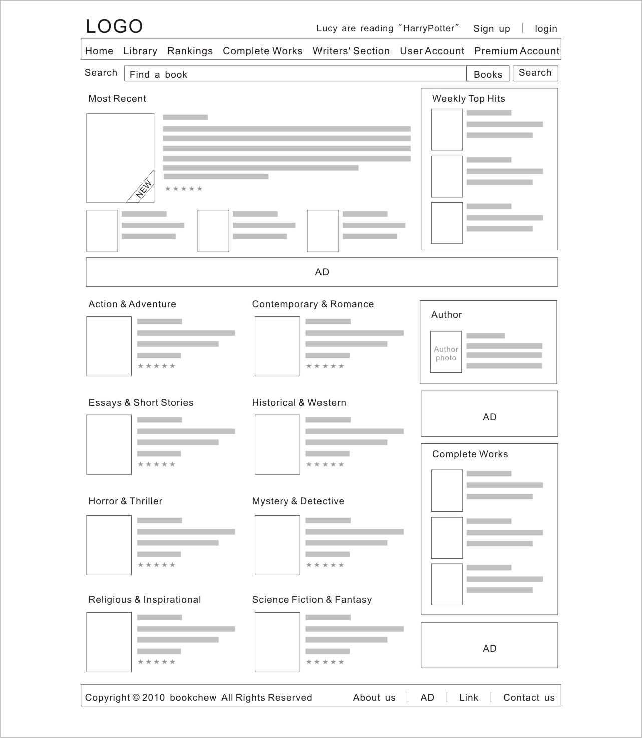 线框图(或者叫线条图)是一个可视化的导图,可以用其来诠释出一个网站的龙骨,同时也可以称其为一个页面的示意图或屏幕的蓝图。线条稿的内容是网页页面上的导航条、各内容区块的布局以简单线条的方式直观展示。帮助设计师以低成本且高效率来进行迭代设计。很多软件可以做线框图,芊雅企服设计师就用photoshop软件来制作,例如线框图样本