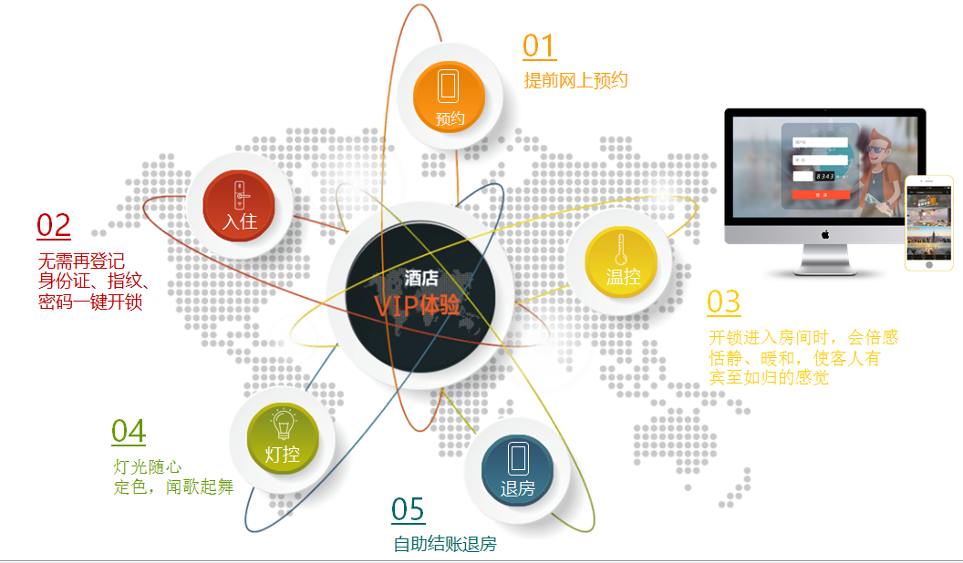 2、提升酒店的智能化、自动化和信息化服务水平,提高酒店的居住环境、服务档次和服务水平。让宾客有种宾至如归的感觉。大大提高酒店的房间利用率和重复入住率。