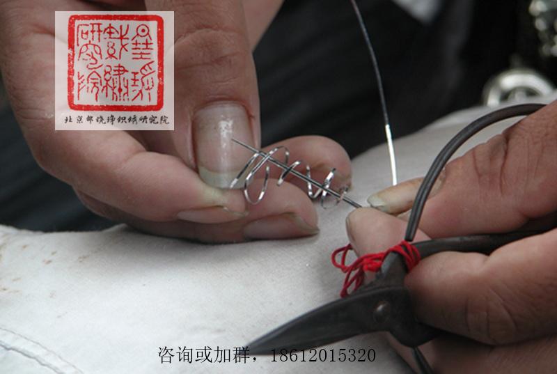 苗族锡绣制品的前后裙片背搭不仅图案有所区别,而且在工艺流程上也不相同。前裙片的制作是先用黑色棉线将图案绣成后浸染浆制,后用小锡片包裹绣成;后裙片及背搭所用的面料则是染好的彩色棉线(暗色调)按一定的图纹织成。底纹绣制分两道工序,先用单色棉线按传统图案刺绣,然后用彩色丝线(暗)在图案的空隙补绣其它花饰,锡片沿单色图案包裹完成后,其效果是在锡纹的间隙中还可见到丝线绣制的彩色暗花。