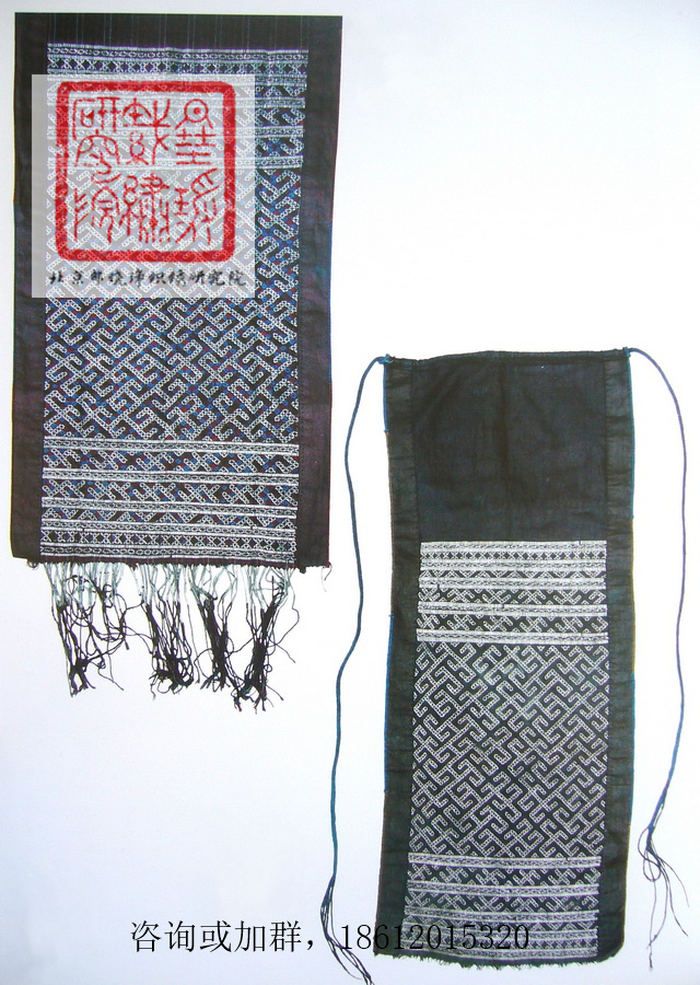 锡绣(图120)制品普遍分为前裙片、后裙片,背搭三种。前裙片苗语为“青黑栋”,长约44厘米,宽约17厘米,用锡绣制的花纹长度约27厘米,宽约14厘米。