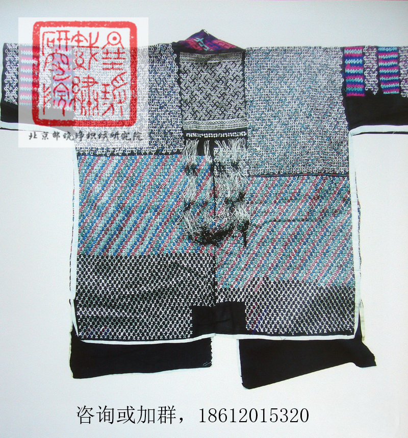 再如苗族衣袖花,流行在贵州雷山、凯里等地,是一种妇女服装的衣袖刺绣品,分头片和正片,头片多用两条几何纹样花边组合,正片才是纹饰主要部位,图案有九龙袖、飞鸟袖、石榴袖等十余种。顾名思义,什么图案就叫什么名称,例龙袖,就是以龙为主,象征吉祥、光明、神圣,分别还有龙鸡袖、盘龙袖、龙钱袖等,千姿百态,古拙可爱。飞鸟袖以千变万化、婀娜多姿的飞鸟形象构成图案,生动活泼,情趣盎然。石榴袖以石榴形做轮廓,用编织的花带沿着外形绣钉,内点缀其他花样,四周添绣少量花纹,图案严谨统一。